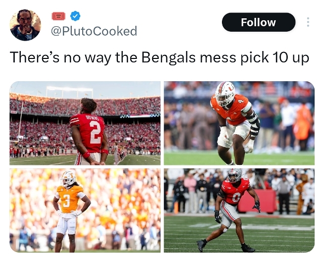 ^ The picks 1-10 from the NYT link, in case it's firewalled for you ... 1. Las Vegas Raiders: Fernando Mendoza, QB, IndianaThis is my fourth mock draft of the 2026 draft cycle, and it’s the fourth time Mendoza is at No. 1, unsurprisingly. The Heisman Trophy winner will be the first player drafted next Thursday and should immediately increase optimism around the Raiders’ organization. 2. New York Jets: Arvell Reese, edge, Ohio StateA pass rusher, be it Reese or David Bailey, appears to be the Jets’ favorite. Reese isn’t a tweener — he is a “whatever you want him to be” edge defender. He can set an edge, play off or be a full-time pass rusher. That type of hybrid skill set can be utilized. 3. Arizona Cardinals: Francis Mauigoa, OT, MiamiIt won’t be surprising if the Cardinals use this pick on a pass rusher such as Bailey, but the idea of securing their right tackle position for the foreseeable future will be an appealing option. It will be interesting to see if the Cardinals receive any viable trade offers to move back. 4. Tennessee Titans: David Bailey, edge, Texas TechHead coach Robert Saleh wants to collect pass rushers and have a healthy defensive line rotation. (In his four seasons at the Jets’ helm, the team drafted a first-round pass rusher twice.) It’s not a hard sell on why Bailey makes sense for Tennessee. 5. New York Giants: Caleb Downs, S, Ohio StateOver John Harbaugh’s 18 years as head coach in Baltimore, the Ravens drafted nine positions in Round 1, including safety (three times). Though using a top-five pick for that position is uncommon, Downs has rare football intelligence and (despite not testing in any drills) is above the line in terms of on-field athleticism. 6. Dallas Cowboys (from CLE*): Sonny Styles, LB, Ohio StateProjected trade: Browns receive Nos. 12, 20 and a 2027 fourth-round pick; Cowboys receive Nos. 6 and 39 The Cowboys could sit at No. 12 and have an impact defender fall to them, but it won’t be surprising if the organization gets aggressive. Styles would not only be an immediate starter at a position of need, but also wear the green dot as a rookie. In this projected trade, the Cowboys surrender two of the first-rounders they hold this year (plus a 2027 pick), but they get back into Round 2. 7. Washington Commanders: Jeremiyah Love, RB, Notre DameA backfield that includes Jayden Daniels and Love would be bad news for defenses. Though the price tag is high for the position, Love has the talent to become a top-five running back before the end of his rookie contract. 8. New Orleans Saints: Carnell Tate, WR, Ohio StatePass rusher or cornerback are attractive options here, but the Saints urgently need to find upgrades at wide receiver — especially as they figure out if quarterback Tyler Shough is a short-term stopgap or a long-term answer. 9. Kansas City Chiefs: Rueben Bain Jr., edge, MiamiBain is one of the more polarizing prospects in this draft (for multiple reasons). But his profile fits Kansas City and would give defensive coordinator Steve Spagnuolo an inside-outside disruptor on the defensive line. 10. Cincinnati Bengals: Mansoor Delane, CB, LSUThe Bengals have drafted several first-round cornerbacks over the years, but never in the top 15. That streak could come to an end with Styles and the top-tier pass rushers off the board in this scenario. Delane would be one helluva consolation prize.