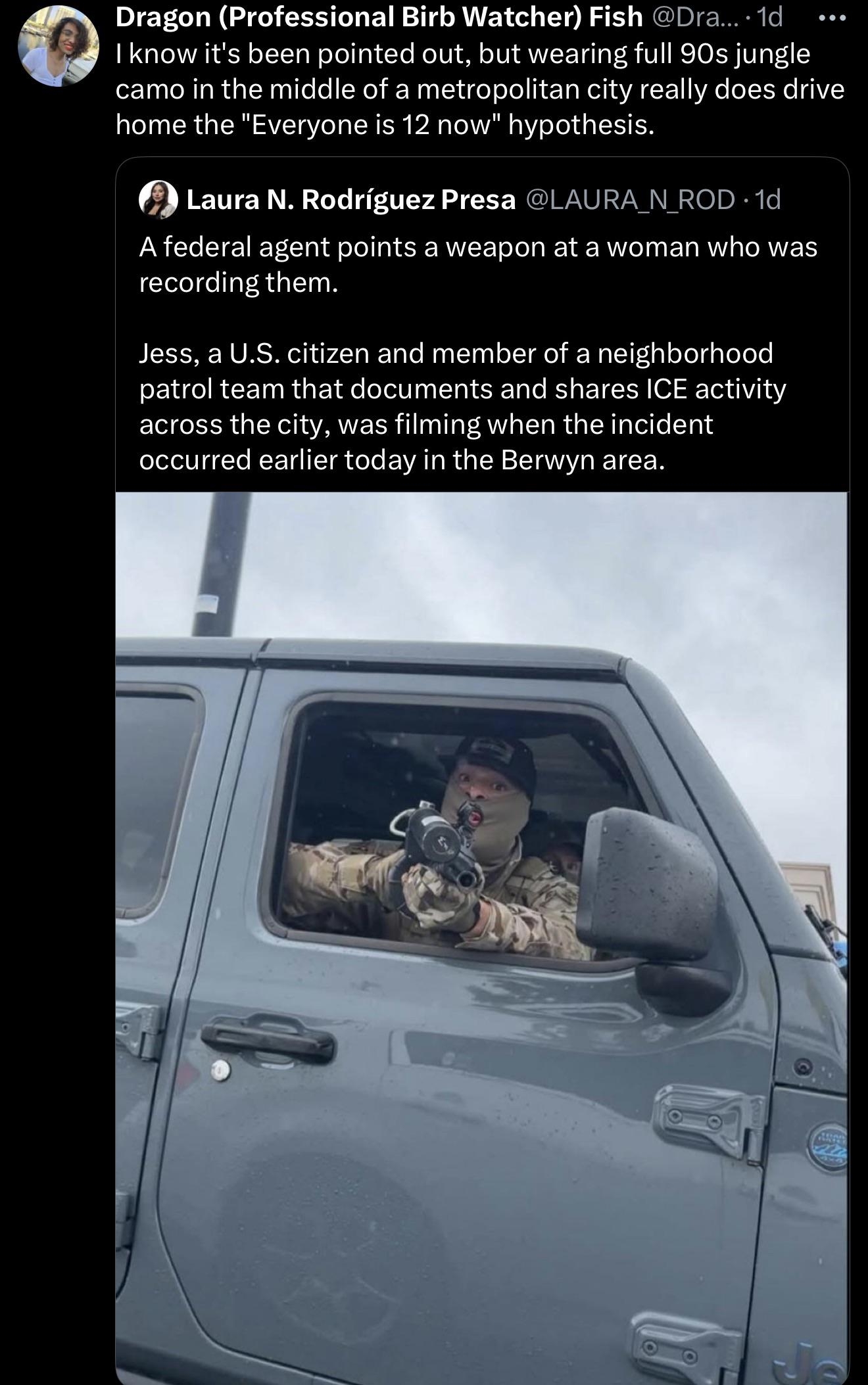 November 9, 2025Nov 9 Author comment_1811528 They're getting bolder with it.. Some other odd insignia have been spotted in LA but this is from Chicago (where Bovino has been repeatedly making Nazi salutes at protestors). Should we ask why this guy is aiming a rifle at unarmed protestors?Just thought I should reiterate that this is a white supremacist militia enacting a program of ethnic cleansing by disappearing random people off the streets of our cities...But sure, "the Democrats are just as bad" or whatever we need to tell ourselves to sleep at night... Something-something Bernie Sanders.. We are so far past that point the whole discussion over political parties in general is fucking comical. Report