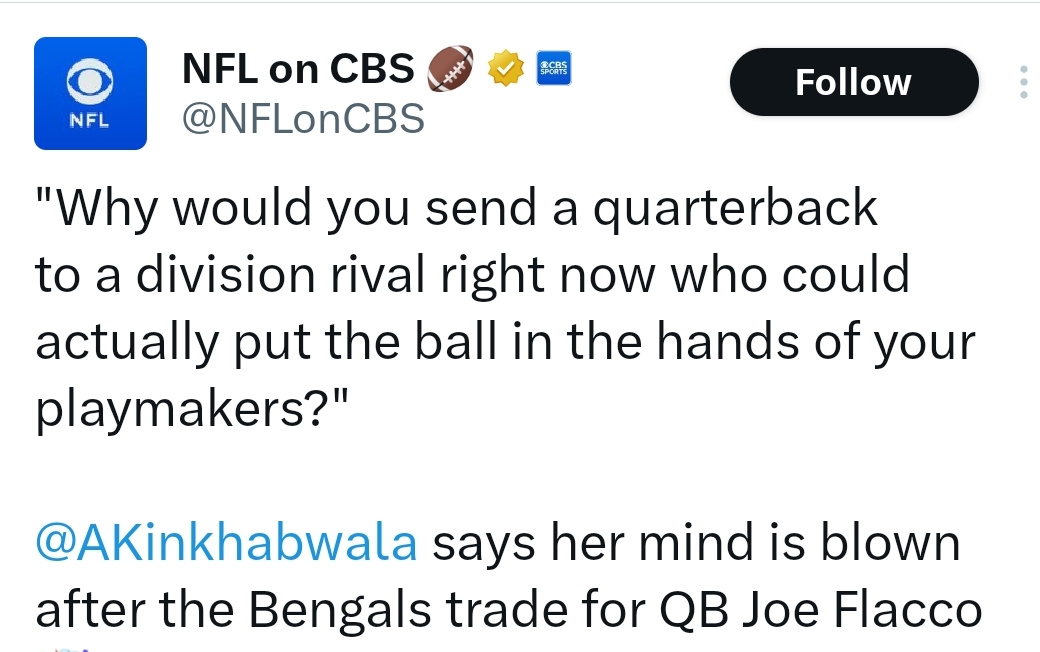 October 7, 2025Oct 7 comment_1807830 Just now, SF2 said:The brain trust had to do something after Chase’s comment.Yeah, and this puts even more pressure on Taylor. If they still stink with Flacco I think he's dead meat. Seems the family understands there is a window with Burrow and think he can make it back if they can limp into the playoffs. Report